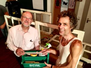 De cursus werd ontwikkeld en verzorgd door Petrik en Ton, twee ervaren onderhoudsmannen met de nodige meters aan kitwerk in hun vingers. Na een heerlijke gezamelijke maaltijd verzorgd door een bewoner (Tonnis, bedankt!) is er wat uitleg gegeven over nut en noodzaak van goed kitwerk én wat informatie over de bijbehorende voorbehandelingen. Daarna was het tijd voor de praktijk, de deelnemers hebben flink kunnen oefenen op oude ramen waarbij een aantal van hen hebben laten zien gekwalificeerd te zijn voor het kitwerk.